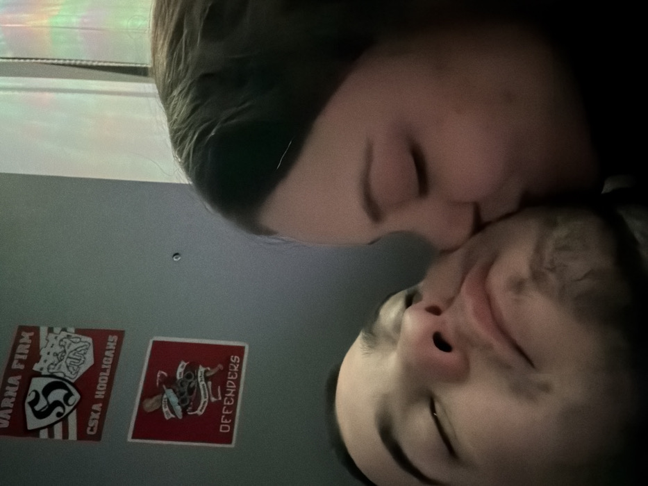 A close-up image depicts two individuals in an intimate interaction against a plain grey wall. A female, positioned on the right, is shown kissing the right cheek of a male, who occupies the left side of the frame. Both individuals have their eyes closed. The male exhibits stubble on his chin and upper lip, with his head slightly angled back. On the grey wall in the upper left, two red rectangular stickers are affixed. The upper sticker reads "VARNA FIRM" at the top and "CSKA HOOLIGANS" at the bottom, flanking two distinct emblems—a shield with an "S" and another design involving hands or chains. The lower sticker features an illustration of a winged creature holding a weapon over chains, with the word "DEFENDERS" at the bottom. These stickers, particularly the "VARNA FIRM" inscription, establish the location as being in or directly related to Varna, Bulgaria. A small, dark, circular object is visible on the wall between and to the right of the stickers. To the far right, a faint, vertical rainbow-colored light effect is present.