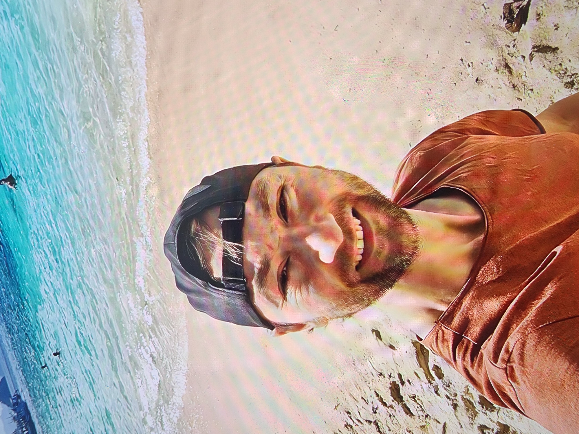 A medium shot of a man with a beard and a backwards baseball cap standing on a beach. He is wearing an orange t-shirt and smiling. The ocean and sandy beach are visible in the background. The location is not identifiable from the image.