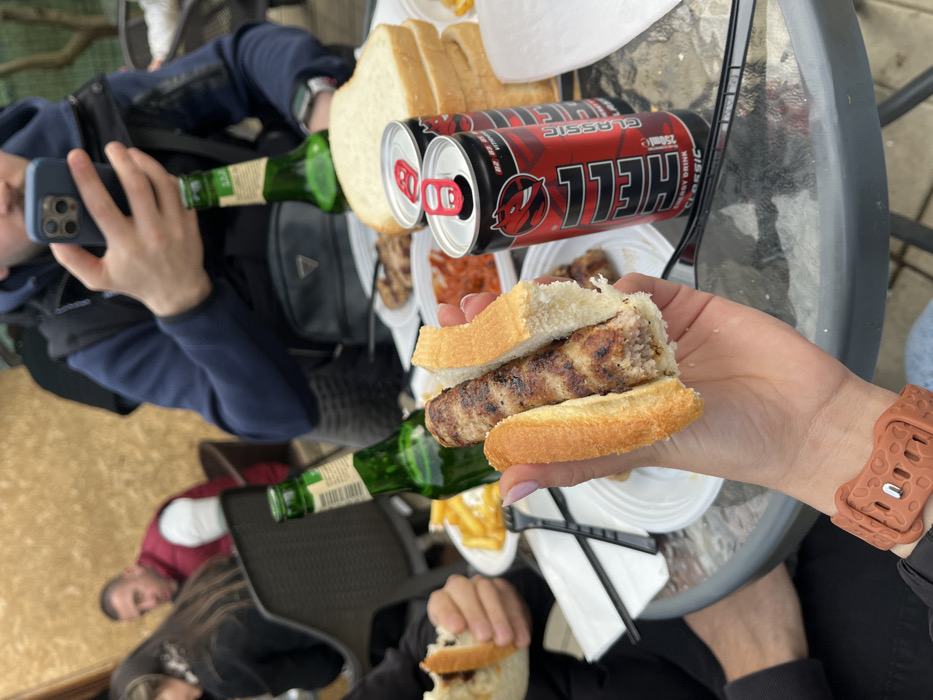 The image depicts an outdoor dining scene at a restaurant or cafe in Leskovets, Bulgaria, captured from a close-up, first-person perspective. In the immediate foreground, a person's left hand, adorned with an orange-brown textured wristband, holds a grilled sausage (likely a *ćevap*) served in a longitudinally split white bread roll. The sausage displays distinct charring and grill marks. Around a round, dark-surfaced table, several individuals are gathered. To the left of the foreground hand, another person's left arm is visible, holding a similar grilled sausage in a bun. Directly opposite the foreground, a person wearing a navy blue hoodie and a black puffer vest holds a smartphone with a light blue case in both hands, actively viewing the screen. A black shoulder bag with a triangular logo is slung across their torso. The table is occupied by various food and drink items. Multiple white plates contain additional portions of grilled meat and golden-brown french fries. A stack of white sliced bread is present. Beverages include two green glass bottles, consistent with beer, and two red "HELL CLASSIC" 250ml energy drink cans, one of which is open with the tab pulled back. A small white dish holds a reddish-orange sauce or relish. Black plastic forks and white paper napkins are also on the table. In the background, partially obscured individuals are seated at other tables. To the left, a woman with dark hair is vaguely visible. To the right, a man wearing a red vest over a white shirt is positioned further back, looking directly towards the camera. The background features a light brown, vertically paneled wall or fence, characteristic of an outdoor patio or dining area. The scene is illuminated by natural daylight.