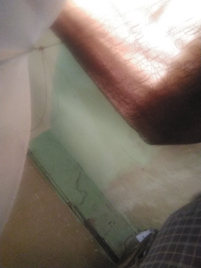 The scene is an interior view within Sabon Tasha, Nigeria. The upper right quadrant is dominated by a dark-skinned human forearm, covered in fine hair, brightly illuminated by an unseen light source from the upper right, creating sharp highlights and deep shadows. In the upper left, a segment of light-colored fabric, consistent with a garment, is visible. The lower right foreground shows a dark, checkered fabric, likely clothing. The background features a light-colored wall or vertical surface on the left, bordering a horizontal greenish-blue painted surface or object. Below this, the floor or lower wall is a light brown, showing minor wear. No direct actions or interactions are discernible.