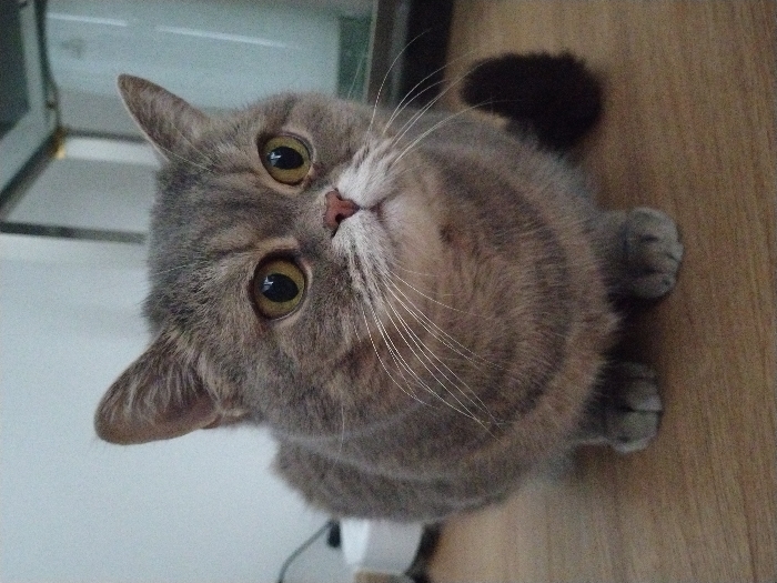 - "A grey tabby cat, consistent with a British Shorthair breed, is depicted sitting centrally on a light brown wooden floor with visible grain" by FM-M4lpO2, licensed under CC BY 4.0