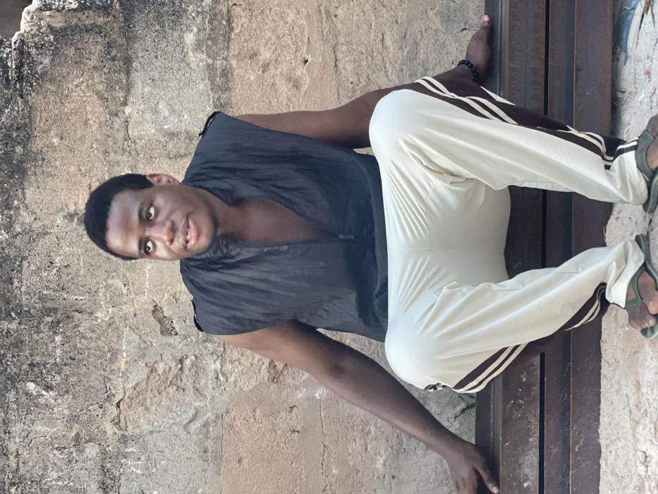 A man sits on a metal bench, leaning against a weathered wall. He wears a black sleeveless shirt and light-colored pants with dark stripes down the sides. Green flip-flops adorn his feet. The man looks directly at the camera with a slight smile. His left hand rests on the bench, while his right hand is out of view. The setting appears to be outdoors.