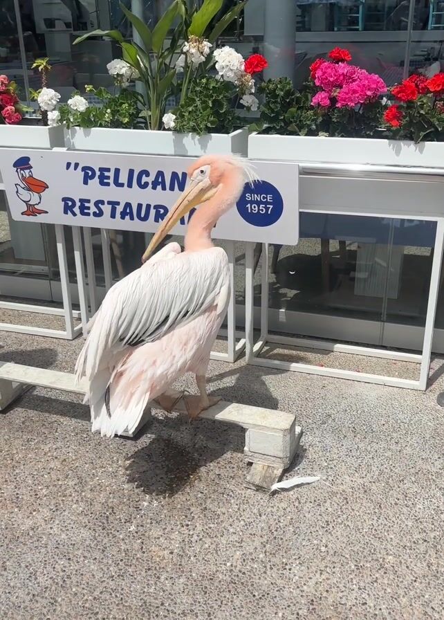A white and pink pelican stands next to a white sign that reads "PELICAN RESTAURANT SINCE 1957." The pelican is on a short white ledge. Behind the sign are planters with various flowers. The background is a building with large windows. The ground is a grey speckled pavement.