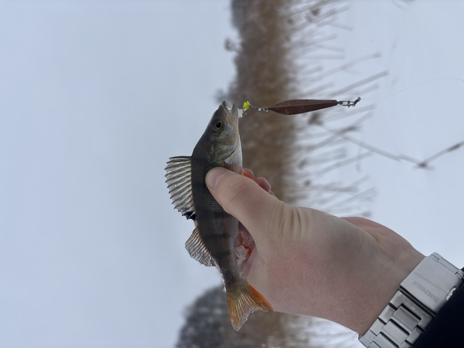 The image, taken in Азярэцкі сельскі Савет, Belarus, presents a human hand holding a European perch (Perca fluviatilis) in a close-up perspective. The perch, estimated to be 15-20 cm long, displays dark vertical stripes on its body and distinct reddish-orange coloration on its caudal, pelvic, and anal fins. A brown, teardrop-shaped metal spoon lure, featuring a yellow bead and a single hook, is embedded in the fish's mouth. A thin fishing line extends from the lure downwards, out of frame. The hand, exhibiting pale skin and visible knuckles, wears a silver-toned metallic wristwatch with a link bracelet on the wrist, with the brand name 'SKMEI' partially legible. The background reveals an overcast winter day with snow-covered ground and sparse, dry, light-brown vegetation, possibly reeds or tall grass. A faint outline of leafless trees is visible in the distant left.