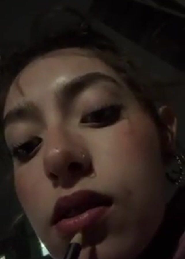 A close-up shot shows a young woman with light brown hair pulled back, applying lip liner. She has fair skin with visible makeup including blush, mascara, and lip color. She has a nose piercing and ornate earrings. The background is dark, suggesting it is nighttime. She speaks to someone off-camera and asks if they are drinking, noting she's had a beer.