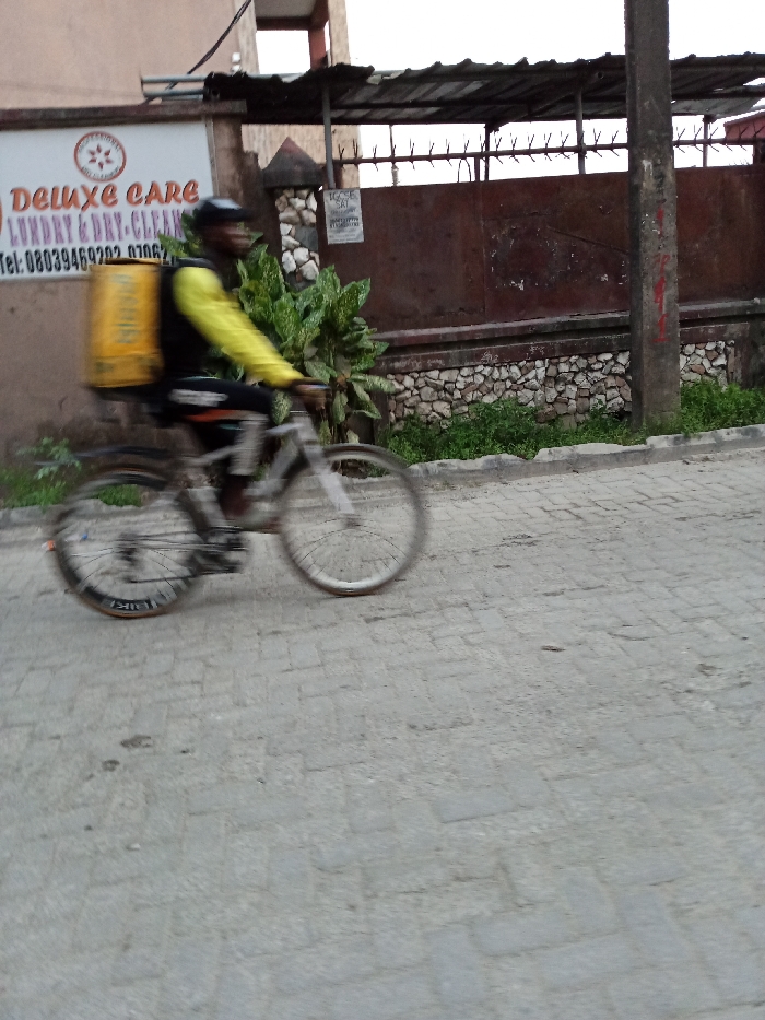 A person wearing a yellow shirt and black cap is riding a bicycle on a brick-paved street. A large yellow bag is strapped to their back. In the background is a building with a sign that reads "Deluxe Care Laundry & Dry Clean." A large rusty gate is visible further back, along with green plants and a utility pole. The photo shows motion blur, indicating the cyclist's speed.