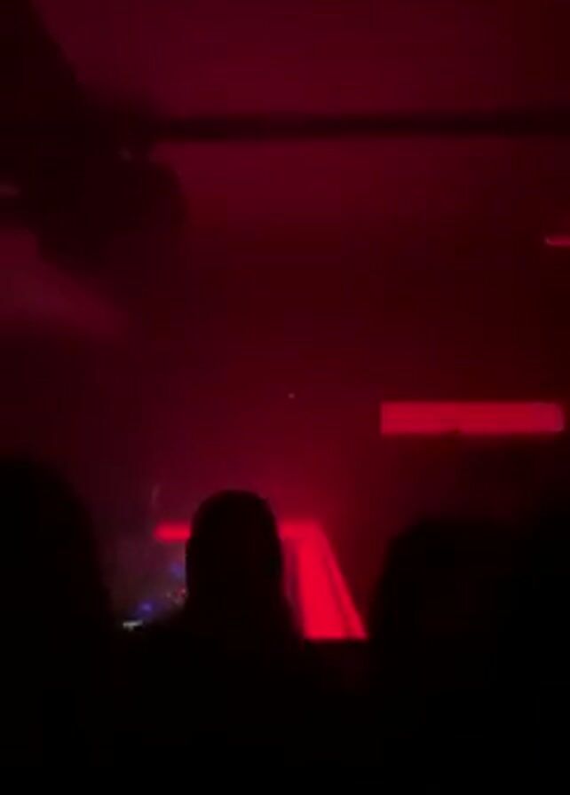 view from the audience at a concert or club, bathed in intense red light. The foreground is dominated by the silhouetted heads and shoulders of several people. A DJ is visible in the middle distance, operating equipment. A red light bar is also visible. The room is dark except for the red lighting elements.