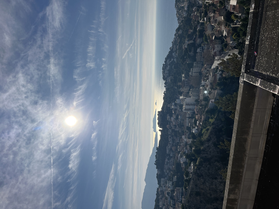 This image presents a high-angle panoramic view of Marseille, France, encompassing a sprawling coastal city, the Mediterranean Sea, and a partially clouded sky. The scene is illuminated by a bright, intense sun positioned in the upper-left quadrant, causing a prominent lens flare and sparkling reflections on the water. The upper two-thirds of the image display a light blue sky populated by wispy, white cirrus clouds arranged in elongated patterns and crossed by several linear airplane contrails. The middle ground is dominated by the Mediterranean Sea, which appears deep blue under the direct sunlight, with a wide, glistening streak reflecting the sun's brilliance across its surface. In the mid-distance on the sea, the Frioul archipelago is discernible, with the distinct forms of Île d'If and the larger islands of Ratonneau and Pomègues visible. To the far left, a range of distant mountains or large hills recedes into a light haze. Below the coastline, the urban fabric of Marseille covers undulating terrain. Numerous residential buildings, including traditional houses with terracotta roofs and multi-story apartment blocks, are densely packed on the hillsides, interspersed with abundant green vegetation and trees. Roads are visible winding through the urban layout. The foreground consists of a dark, textured concrete ledge or rooftop edge, which spans the bottom third of the frame. This surface shows signs of weathering and is speckled with small white deposits, possibly bird droppings or debris. A small, indistinct pink object is present on the concrete surface in the lower right corner. No individuals or specific actions are visible within the scene.