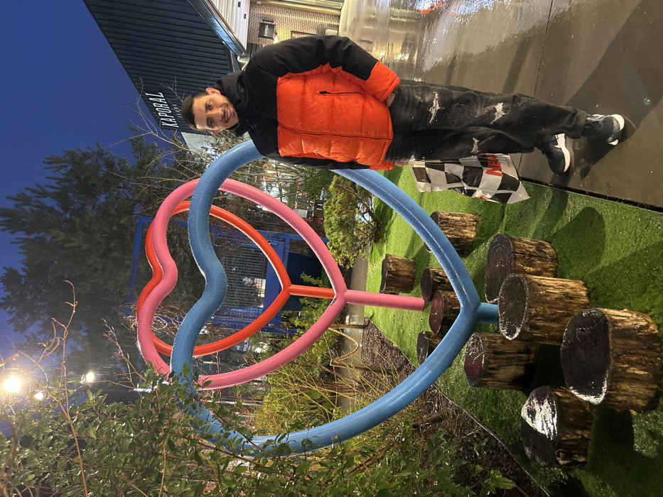 A man in a black and orange jacket and black pants stands next to a whimsical outdoor art installation. The art consists of three entwined hearts in blue, pink, and orange, supported by a series of log stumps on artificial grass. The scene is set at dusk, with a building visible in the background. The ground is wet, and the overall impression is playful and artistic.