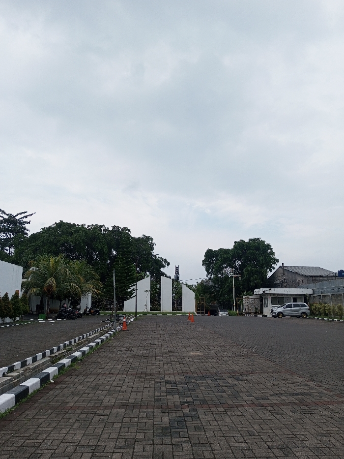 The image displays an outdoor paved entrance area, likely within the city of Cianjur, Indonesia, observed under an overcast sky