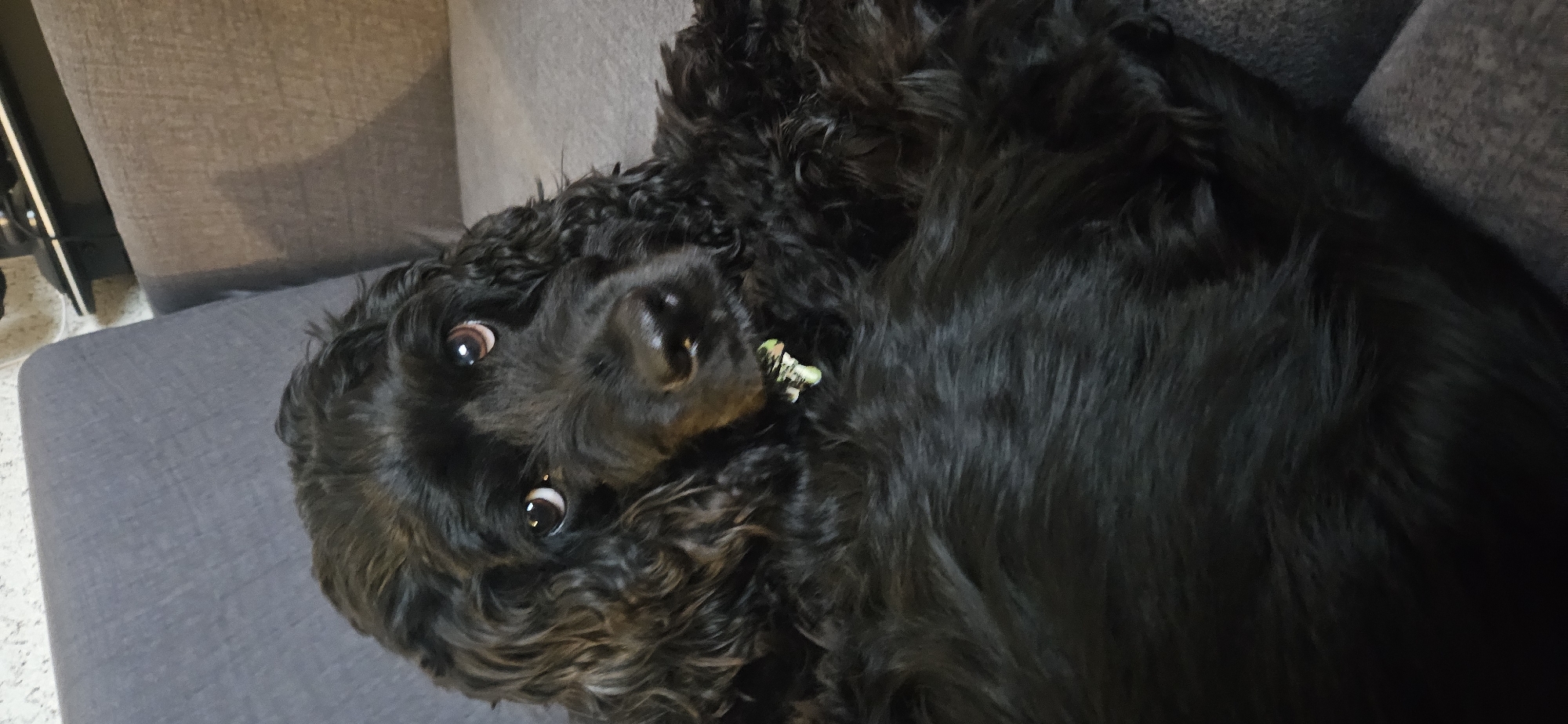The image depicts a black-furred canine, consistent with a Cocker Spaniel, positioned centrally on a grey upholstered sofa in an indoor setting within Sofia, Bulgaria. The animal's head and upper torso are visible, with its body curled. It gazes directly forward with large, brown, reflective eyes. Its fur is long, wavy, and uniformly black. A small, irregularly shaped object, predominantly light green with darker speckles, is lodged near or partially within its lower jaw area, below the nose. The immediate background shows the texture of the grey sofa. Further back, above the sofa, a light-colored, possibly textured wall is visible, with a dark, horizontal surface or shelf containing indistinct shapes and wires in the upper right portion of the frame. No human subjects are present, and no actions or interactions beyond the dog's direct gaze are discernible.