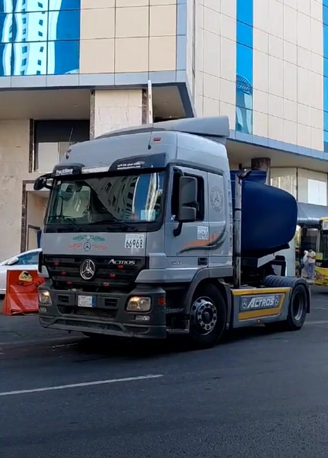 A Mercedes-Benz Actros truck is seen in an urban environment. The truck is gray with some decorative stripes and the word "ACTROS" on its lower side in yellow text. It has a dark blue tank attached to it. The truck is parked on a street next to a modern building with mirrored windows. A yellow bus with passengers can be seen behind the truck. A person in white is walking towards the bus. The video appears to have been taken during the daytime. The environment appears to be Saudi Arabia.