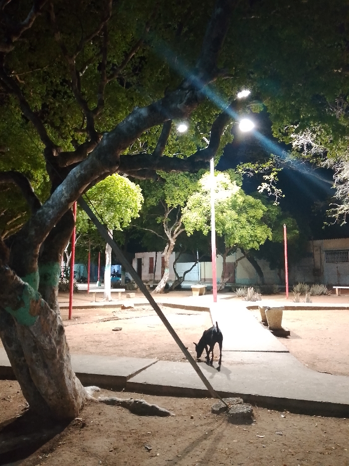 The image depicts a scene at night in a park or plaza in San Antonio de Los Altos, Venezuela (11.09 latitude, -63.943 longitude). The scene is illuminated by multiple streetlights, casting a bright glow on the surrounding area. A large tree dominates the foreground, its thick trunk and branches reaching towards the sky. A black dog is sniffing the ground in the center of the image, while a concrete walkway extends towards a building in the background. The walkway is flanked by small trees and shrubs. The buildings in the background are not clearly visible, but they appear to be residential structures. The ground is covered in dirt and gravel, and the overall atmosphere is quiet and peaceful. There are no people visible in the image.