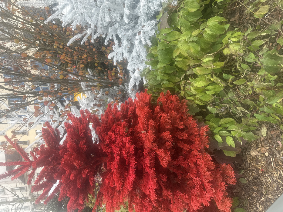 The image displays an outdoor urban decorative installation in Saint-Germain-en-Laye, France. The foreground is dominated by a large, conical artificial Christmas tree, uniformly colored bright red, positioned on the left. Adjacent to it on the right are several smaller, conical artificial Christmas trees, uniformly colored white. Between and behind these artificial trees, a deciduous tree with slender, dark branches and sparse, small, ovate leaves exhibiting an orange-brown autumn coloration is visible. The ground directly beneath the red tree is covered with dark brown mulch. To the right of the red tree and extending into the lower right quadrant, an area of green leafy ground cover is present, with some leaves showing signs of browning. In the background, sections of light-colored multi-story building facades are visible, featuring multiple rectangular windows, some equipped with blue-slatted shutters. No individuals are present in the frame.