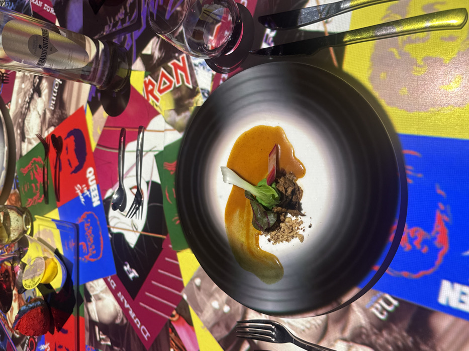 A dinner setting is observed from an elevated perspective. The central object is a round, white plate with a black gradient rim, holding a prepared dish. The dish consists of an orange-brown liquid base, a small pile of brown granular solids, a dark irregular solid object, a single light-green leaf stalk, and a small reddish-purple leaf fragment. A silver four-tine fork is positioned to the left of the plate. Above the plate, a silver spoon and a smaller two-tine fork are arranged. To the right of the plate, two silver-colored knives with yellow-tinted handles are present, alongside a stemmed glass containing a clear liquid. Further back on the right, a clear glass bottle labeled "CHAUDFONTAINE" stands upright. In the upper-left corner, a small blue rectangular tray holds a yellow foil-wrapped condiment packet and a lemon wedge, next to a red, spherical, textured item. The table surface beneath the items is illuminated by projected, multi-colored images featuring a collage of music album covers and band logos, including those for Queen, Iron Maiden, Duran Duran, and Madonna. This scene takes place at VANE Restaurant, located within the NH Collection Eindhoven Centre, Eindhoven, Netherlands.