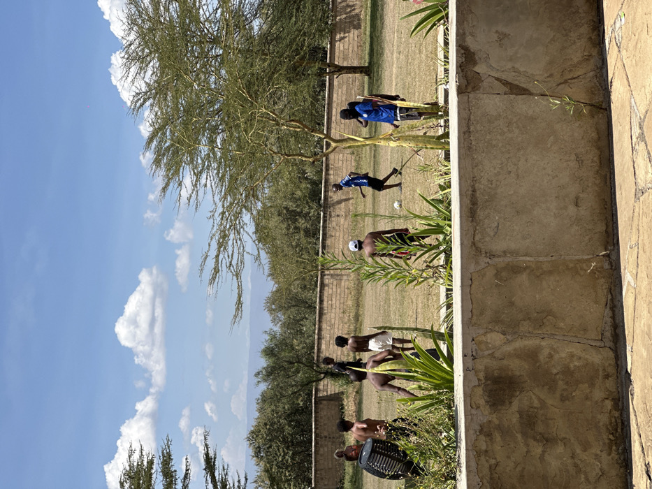 The image captures an outdoor scene in Olkaria ward, Kenya, under a bright blue sky with scattered white cumulus clouds. In the immediate foreground, a light-brown, textured concrete or stone planter box, topped with various green leafy and succulent plants, partially obstructs the view. Beyond this, a dry, sparsely green grassy field serves as the setting for approximately eight males, appearing to be young adults or teenagers, engaged in a casual game of soccer. One individual, positioned in the right-midground, wears a blue long-sleeved shirt and dark shorts, actively kicking a white soccer ball. Another male, further to the right, wears a blue short-sleeved shirt and dark shorts. The remaining individuals are mostly shirtless, wearing dark shorts, with one individual in the left-midground wearing a white cap and another on the far left near a black plastic crate or bin. Several acacia-like trees with light green, sparse foliage are distributed across the field. A low, light-brown, block-built wall extends horizontally across the mid-background, behind which lies a denser cluster of green trees and shrubs. Distant, hazy blue mountains are visible on the horizon.