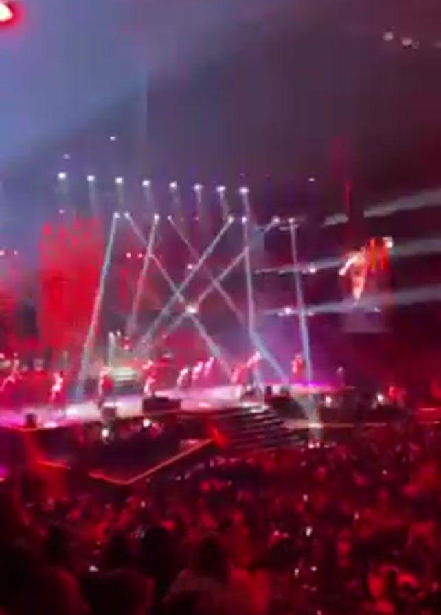 The video depicts a concert venue filled with people, focused on a brightly lit stage where performers are dancing. A large screen displays images of the performer. Red and white lights illuminate the stage and the audience. The environment is dark aside from the stage lighting. People in the crowd are recording the event on their phones.