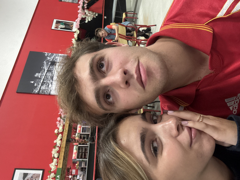The image captures two young adults in the foreground of an indoor commercial establishment in Décines-Charpieu, France. A female, with light brown hair parted on the left, occupies the left side of the frame, looking towards the viewer. Her right hand, adorned with a delicate ring on the ring finger, is positioned near her lower cheek. To her right, a male with brown hair looks upwards and to the right. He is wearing a red polo shirt with yellow and white stripes on the collar and shoulders, and an Adidas logo is visible on the left chest. The background features red walls decorated with a horizontal garland of white and pink artificial flowers. Above this garland, a framed black-and-white print depicting the New York City skyline, including the Brooklyn Bridge, is prominent. To the far left, a partial view of another framed image is visible. Behind the floral garland, a service counter area with commercial refrigeration units, stocked with beverages, is present. Further to the right in the background, a third female individual with dark hair tied back is seated at a table with red-framed wooden chairs, wearing a red shirt under a blue vest and looking towards the left. Additional tables and chairs are visible in the surrounding area.