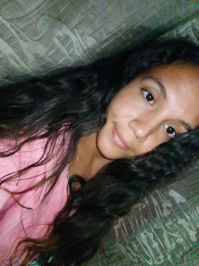 The image depicts a female individual in a close-up portrait, located in Juan Griego, Venezuela. The subject, appearing to be a young adult, is lying down and looking directly at the camera with a subtle smile. She has long, dark, wavy hair that extends across the left side and bottom of the frame. She is wearing a light pink long-sleeved top and a thin, gold-colored chain necklace is visible around her neck. Her head rests on a textured surface, possibly a pillow or upholstered furniture, which features a light-colored, abstract or floral pattern against a muted greenish-grey background. The lighting is soft and frontal.