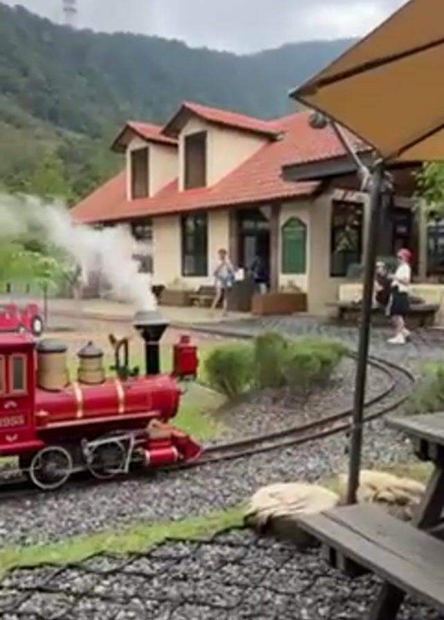 A small, red, toy train is seen pulling away from a miniature train station. The building appears to be a single-story structure with a red-tiled roof and beige walls, and it is surrounded by greenery and a gravel walkway. A man dressed in a blue uniform and cap is seen operating the train. There are at least 5 young children riding in the train's passenger car. The train puffs out white smoke as it slowly moves along the tracks. Picnic tables can be seen on the right side of the shot. A tower can be seen in the distant background. The sky is overcast.