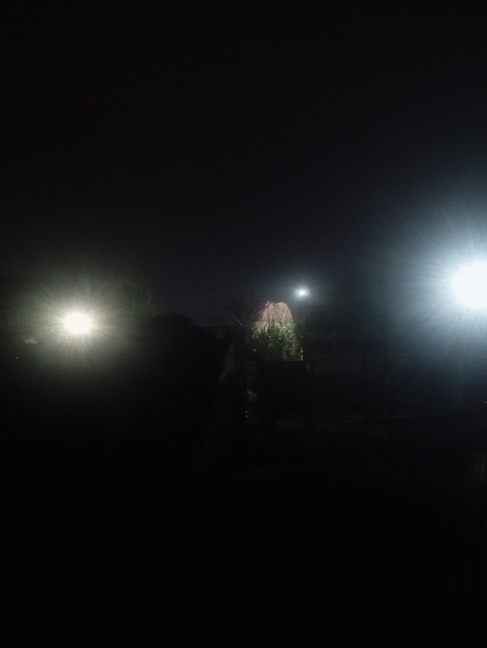 The scene depicts an outdoor nighttime environment in Chah Sultan, Pakistan. Two intensely bright light sources, exhibiting significant lens flare, are present: one in the lower-left quadrant and another in the middle-right quadrant. Between these primary light sources, in the central mid-ground, partially illuminated vegetation is visible, including a tree or large bush with light-colored or pinkish foliage, and further dark green foliage to its right. A third, smaller, circular light source is discernible higher in the central-right background. Background elements and ground features are largely obscured by darkness and light effects. No individuals or specific actions are identifiable.