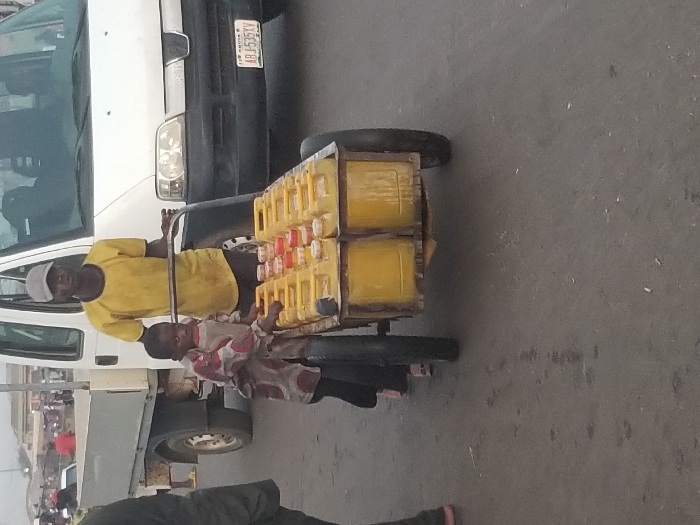On a paved road in Lokoja, Nigeria, an adult male and a young child are engaged with a loaded handcart. The adult male, wearing a grey baseball cap and a yellow t-shirt, stands behind the cart, pushing it with both hands on the handles. A young child, dressed in a red, white, and brown patterned long-sleeved shirt, is positioned to the left of the handcart's front, looking towards the viewer, with one hand near the cart's contents. The handcart is a metal-framed, two-wheeled structure with a wooden platform, laden with approximately sixteen yellow plastic jerrycans. The jerrycans in the front row display a mix of red and cream-colored caps. In the immediate background, a white commercial van, identified by its Peugeot badge and Nigerian license plate ABJ-535XV, is visible. To the left and further back, a white utility truck is partially discernible, along with other distant figures, indicating a street or market environment. The road surface is dark grey asphalt, and the scene is illuminated by daylight.