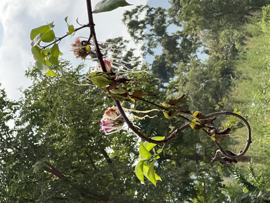 A plant branch is depicted against an outdoor natural backdrop in Logba Adzakoe, Ghana. The central subject is a dark brown, woody branch, approximately 3 cm in diameter, curving from the lower left to the upper right. Attached to this branch are three distinct clusters of flowers. Each flower cluster displays a reddish-pink base from which numerous long, thin, wavy, pale yellow-white filaments, estimated to be 5-7 cm in length, extend radially. Interspersed along the branch are various leaves: some are vibrant green and ovate, appearing healthy, while others are shriveled, brown, and desiccated. Several small, green, elongated structures, consistent with seed pods, are also visible hanging from the branch. The background consists of a dense, out-of-focus canopy of lush green trees, suggesting a heavily vegetated environment. Above the tree line, a light blue sky with scattered white cumulus clouds is present. Faint outlines of distant, tree-covered hills are discernible on the horizon. The scene is illuminated by natural daylight. No individuals, animals, or man-made structures are present within the frame.