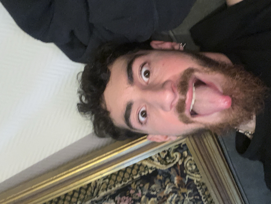 A close-up, high-angle selfie-style photograph depicts an adult male from the chest up, centered in the frame. The male has dark, curly hair, a reddish-brown beard, and brown eyes. He wears a dark shirt and a silver-toned chain around his neck. Both eyes are wide open, and his tongue is fully extended from his mouth, indicating a playful or exaggerated expression. A silver hoop earring is visible in his left ear. The background on the left features a portion of a gold-framed artwork, likely a tapestry, displaying intricate patterns in dark and light tones. To the right, a mass of dark fabric is present. The wall behind him is a light, possibly off-white, color with a faint chevron or similar texture. The image does not contain specific visual cues to identify its precise location within Strasbourg, France.