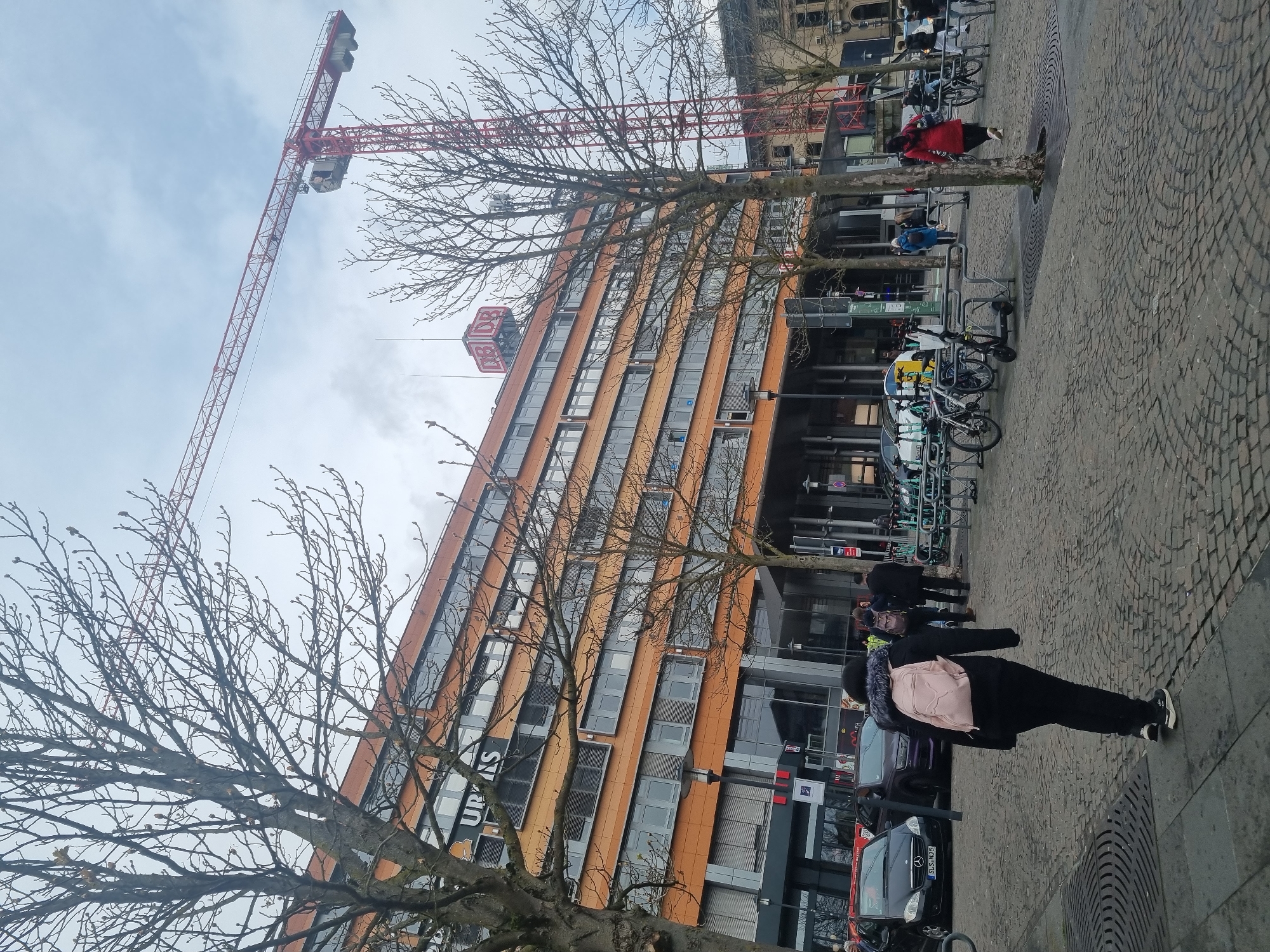 street scene in Saarbrücken, Germany. The camera is looking upwards at an angle. In the background is a tall building with orange and grey panels, bearing the logo "DB DB" at the top. A red construction crane is visible on the left side of the frame. Several leafless trees stand in front of the building. The street is paved with cobblestones. People are walking on the sidewalk. There is a bicycle rack with several bikes parked in it. Cars and traffic signals are visible in the lower portion of the image. A woman wearing black clothing and carrying a light pink backpack is walking along the sidewalk. The sky is overcast.