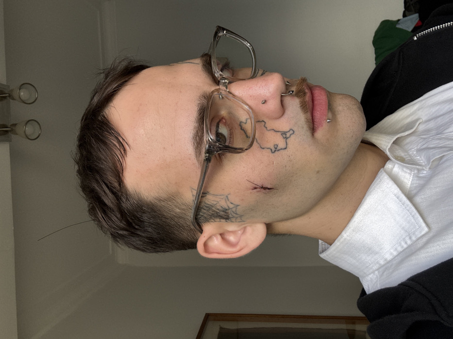 A light-skinned person is shown from the chest up, angled to the right. They wear transparent-framed glasses. The individual has dark hair, a mustache, a nose piercing, and a lip piercing. Visible tattoos include a spiderweb near the ear and a map outline on the cheek. A small wound with sutures is on the lower face. They are wearing a white collared shirt with a black jacket. A door handle and a picture frame are partially visible in the background.