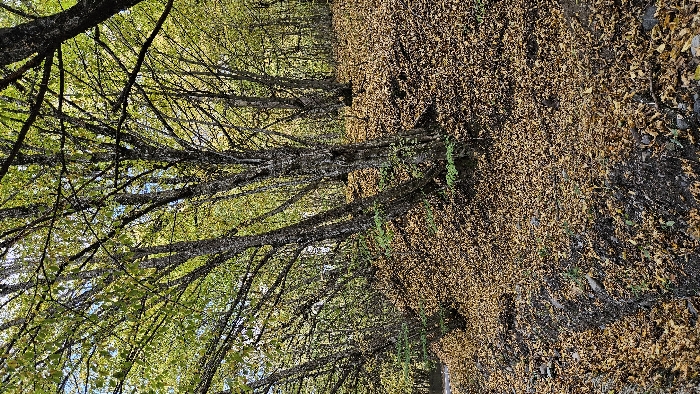 The image displays a wooded hillside located in Dilijan, Armenia, during what appears to be an autumnal period. The foreground and midground consist of a sloping terrain densely covered with a layer of fallen, dry leaves, primarily in shades of light brown and yellow. Several deciduous trees with textured, light grey-brown bark and branching structures rise from this leaf-covered ground. Their canopies, visible against a partially obscured sky, exhibit foliage in green and yellowish-green hues. Sparse green undergrowth or saplings are present near the bases of some trees and within the leaf litter. The extreme lower left edge of the image shows a darker area of exposed earth, possibly indicating the edge of a path or disturbed ground. No human figures or discernible man-made structures are present within the frame.