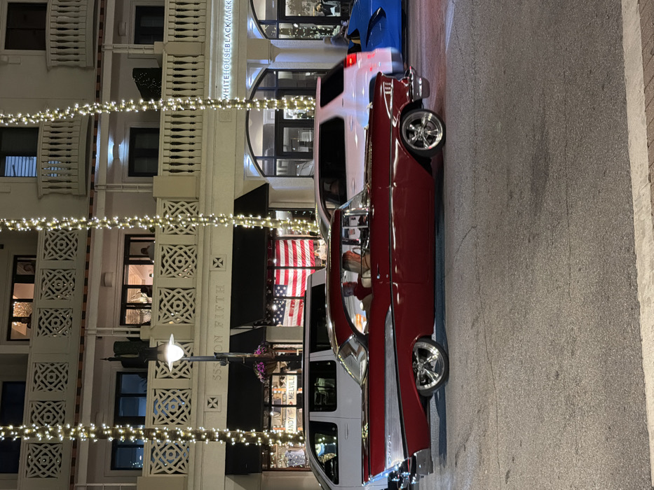 This is a nighttime street scene on Fifth Avenue South in Naples, Florida, United States of America. A dark red 1957 Chevrolet Bel Air classic car, featuring custom chrome wheels and a chrome side trim, is the primary subject, positioned centrally and moving right. Two occupants are visible in the front seats of the classic car. Behind and to its left, a white minivan or large SUV is partially visible. To the right, a bright blue, low-slung modern sports car is partially visible, positioned behind the classic car. The background consists of multi-story buildings illuminated by interior lights and extensive string lights wrapped around vertical elements, likely palm trees, and along architectural features. The buildings display white balconies with intricate, repeating geometric patterns. Prominent signage identifies "SSS ON FIFTH" on one building and "WHITE HOUSE BLACK MARKET" on an adjacent building to the right. Below "SSS ON FIFTH," another storefront displays "ANDY" and "MELVILL," likely "Brandy Melville," with a large American flag prominently displayed in its window. A street lamp with a white globe is centrally mounted on a pole. Individuals are visible within the illuminated shops and on the balconies of the buildings. The asphalt road in the foreground shows minor cracks and markings.