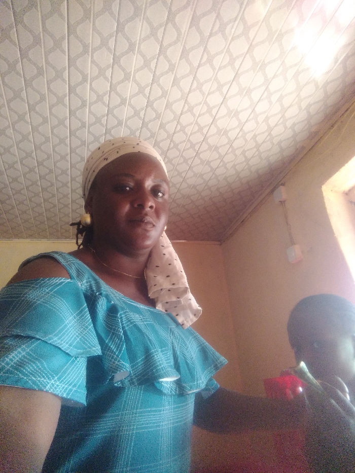 The image displays an indoor scene featuring an adult female and a child. The adult female, with dark skin, occupies the foreground, facing the camera with a neutral expression. She wears a light-colored headwrap with dark polka dots, a teal off-shoulder top featuring ruffles and a white plaid pattern, a gold-colored necklace, and round, light-colored earrings. Partially visible in the lower right background, a child with dark hair holds a red cup or object. The setting is an interior room with a ceiling constructed of white PVC panels adorned with a repeating wave-like pattern. The visible background wall is painted a light beige, featuring two vertically aligned, light-colored electrical outlets or switches. Natural light illuminates the right side of the frame, originating from an unseen window or opening. The location is an indoor residential or private commercial space in the city of Unknown, Unknown.