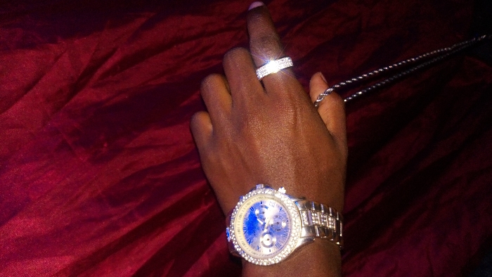 The image displays a close-up, angled view of a human left hand against a dark red, wrinkled fabric background, located in Ndeiya, Kenya. The hand exhibits dark skin pigmentation. A silver-toned wristwatch is worn on the wrist, featuring a crystal-encrusted bezel and strap links; its face is silver with blue sub-dials and Roman numeral and stick hour markers. On the ring finger, a silver-toned, multi-row band ring, also appearing crystal-encrusted, is visible. The fingers are slightly curled, holding a silver-toned rope chain that dangles downwards. The scene is illuminated, highlighting the reflective surfaces of the jewelry.