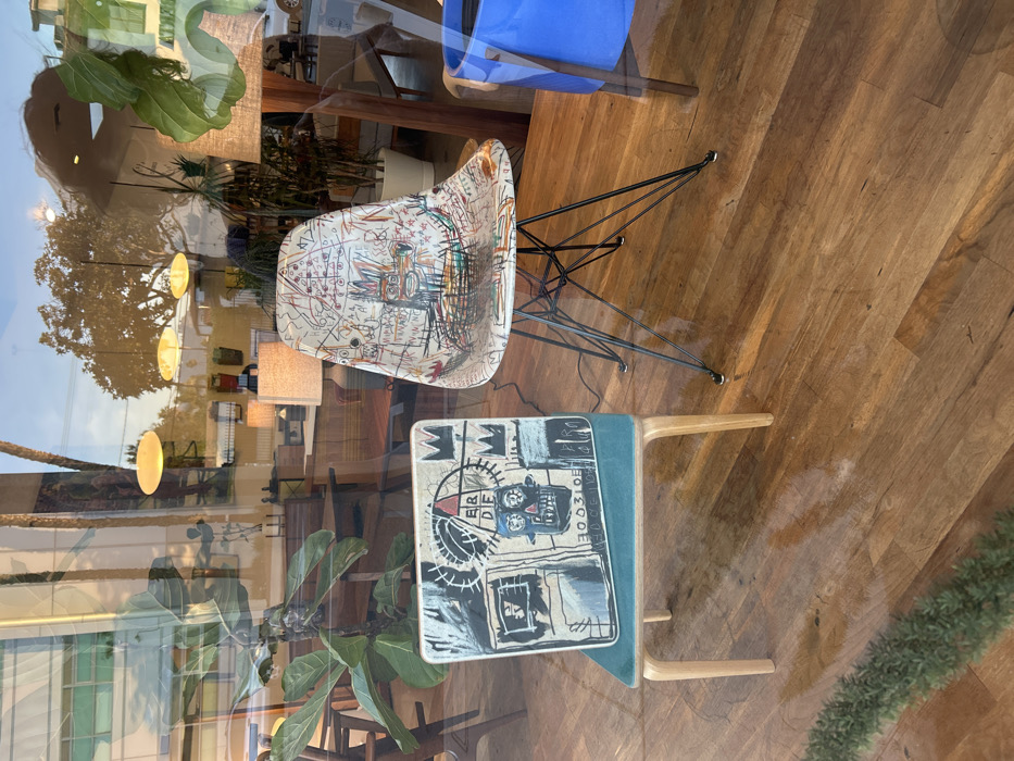A chair with a white seat and black metal legs is centered, adorned with art reminiscent of Basquiat. Next to the chair, a small, side table with a matching Basquiat-inspired art piece on the top is also visible. The furniture appears to be displayed in a store window, as reflections of trees and buildings are visible in the glass. The floor beneath is made of light-colored wood.