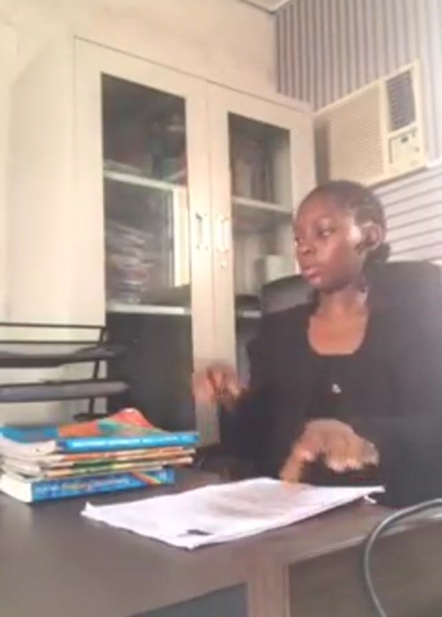 In an indoor setting, a light-skinned woman sits at a brown desk and sorts through papers. She is wearing a dark long-sleeved shirt. A stack of books sits to her left, and an additional stack of papers is in front of her. Behind her is a white cabinet, and a small air conditioning unit can be seen near the top right of the frame. The walls appear to be covered with light-colored striped wallpaper. The woman picks up papers from a tray on her left, looks at them, and places them back on the tray.