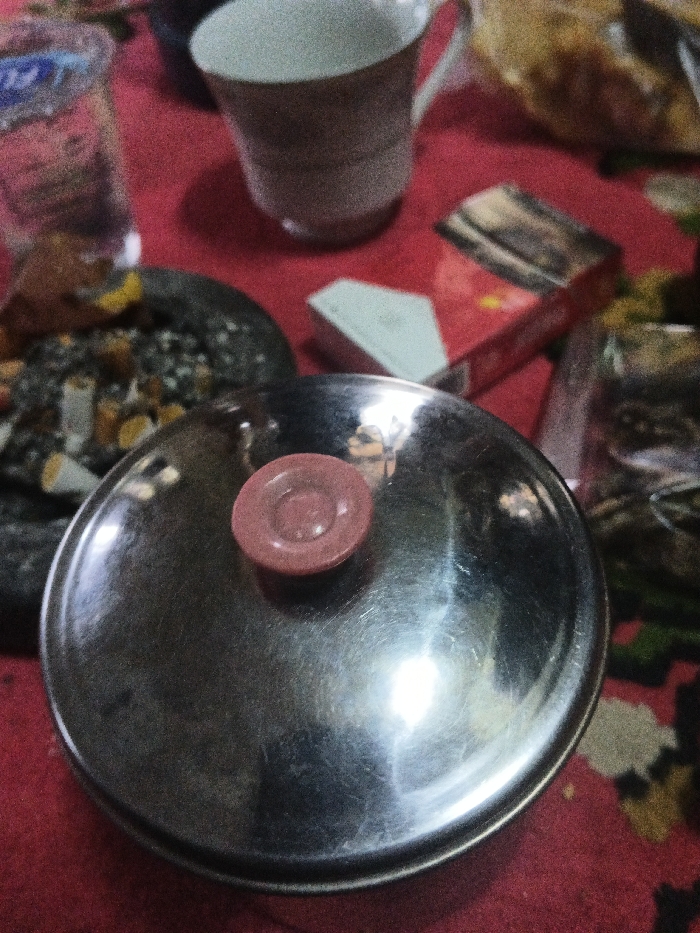 The image displays an indoor scene on a red textile tablecloth, patterned with darker tones, within the city of Unknown, Unknown. In the foreground, a round, reflective stainless steel pot or bowl with a reddish-brown plastic handle on its lid occupies the central view. To the left of this pot, a dark-colored ashtray is filled with numerous cigarette butts and ash. Behind the ashtray, a clear glass containing water with a blue label (partially visible) stands next to a light-colored ceramic mug. To the right of the central pot, a red cigarette pack is partially open, revealing a white interior. Further right and in the background, a clear plastic bag contains indistinct items. No individuals are visible, and no active interactions are depicted; the objects are arranged on the table.