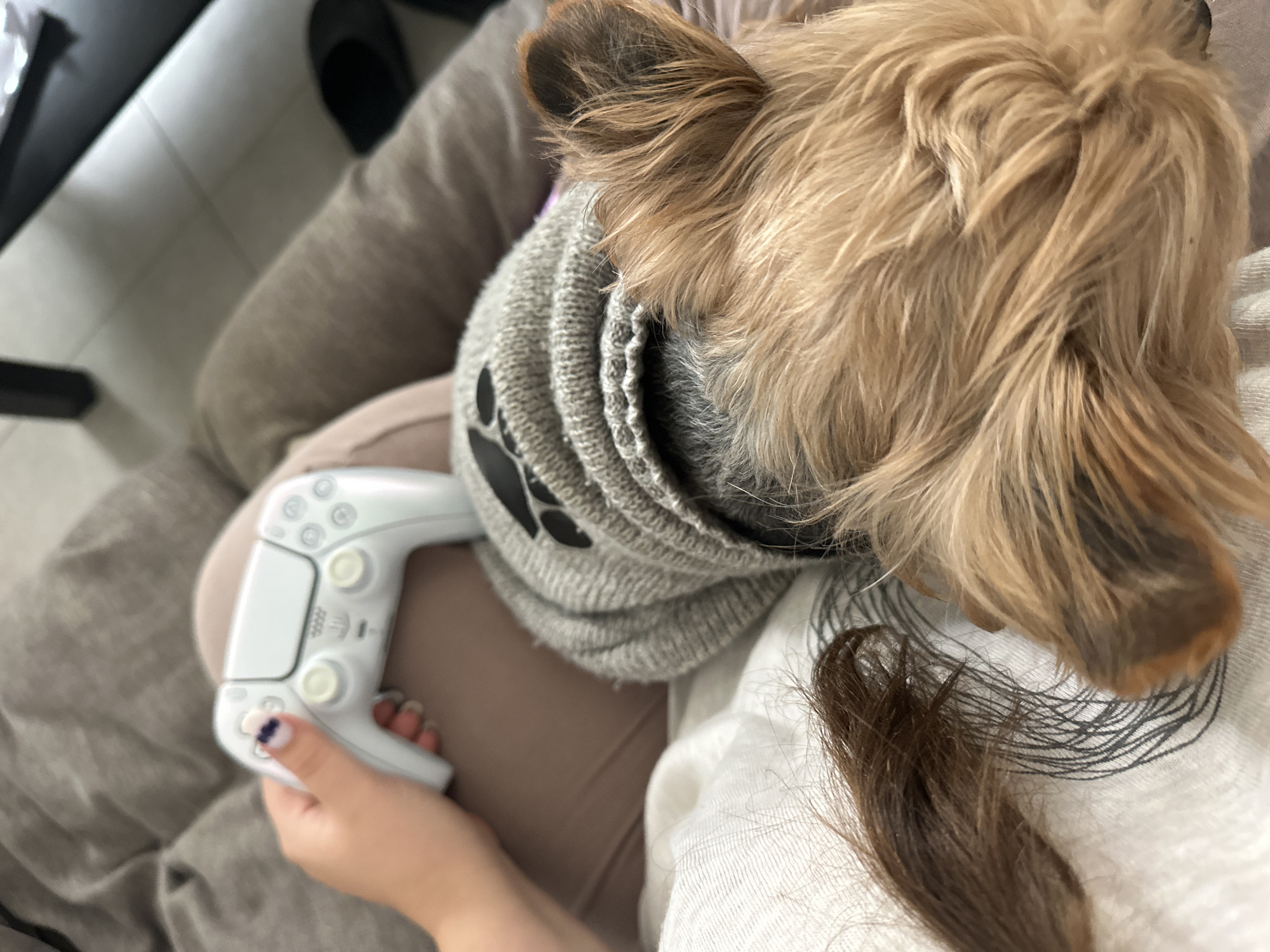 This image depicts an indoor scene in Ramat Gan, Israel. The foreground features a human left hand with white and purple-tipped fingernails holding a white PlayStation 5 DualSense controller. The hand rests on the lap of an individual, covered by light brown/taupe pants or leggings. To the right, a small dog with light brown fur, possibly a Yorkshire Terrier, is resting on a light-colored fabric, which has dark thread patterns. The dog is wearing a gray knitted hat adorned with a black paw print design. The background is blurred, showing a gray textured surface, likely a couch or cushion, and indistinct shapes of dark furniture and light-colored flooring.