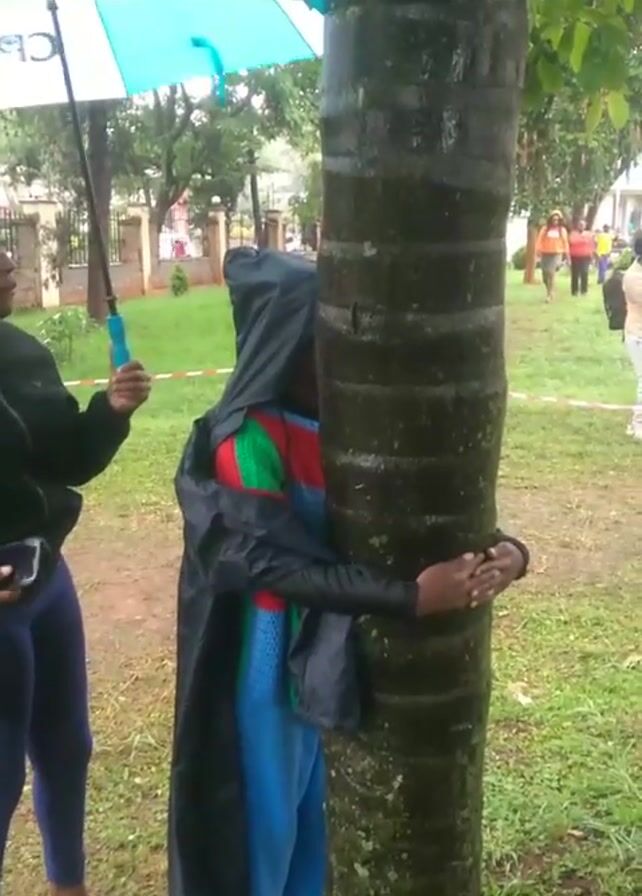 woman embracing a tree in a grassy outdoor area. It is raining. The woman is wearing a dark raincoat and blue pants and light-colored footwear. She is hugging the tree with both arms. A woman next to her holds an umbrella and a phone. There are other people in the background, and the area is bordered by a low stone wall with fencing. A caution tape is also seen in the background.