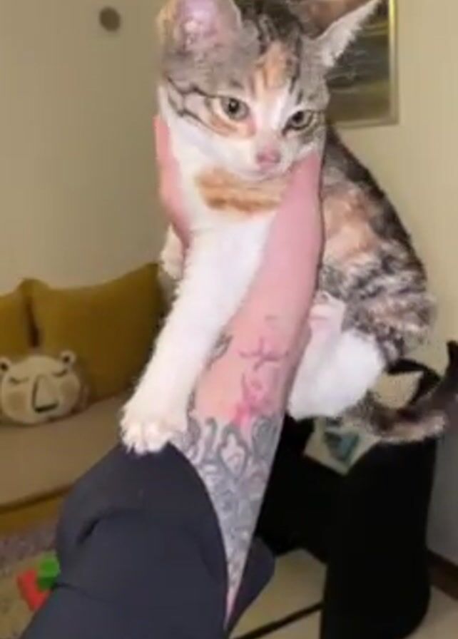 A person with a tattoo-covered arm is holding a small, multi-colored kitten in their hand