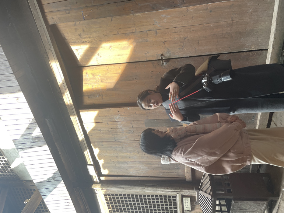 Two women stand inside a wooden structure, possibly a traditional building. One woman, wearing a pink jacket and light pants, faces the other. The second woman wears a dark coat and holds a camera, seemingly giving instructions. Wooden planks form the floor and ceiling, with sunlight streaming through gaps. The scene includes a patterned wooden structure and a sign with text, adding to the traditional ambiance. The angled perspective enhances the depth of the interior space.