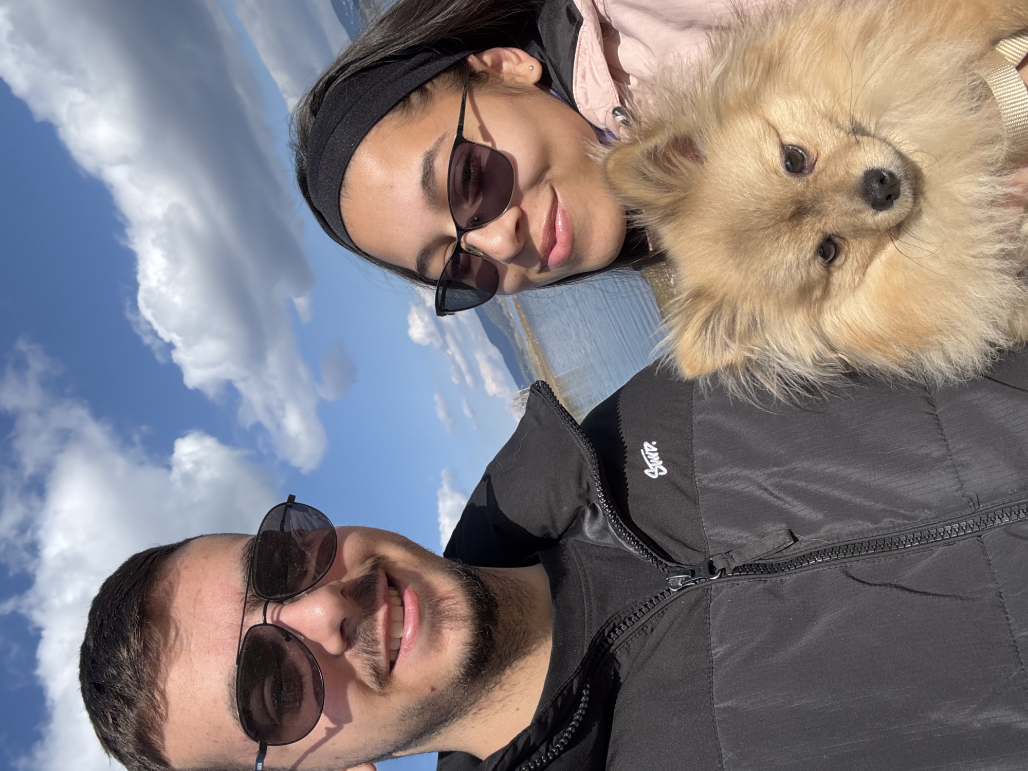 The image captures a selfie-style portrait of two individuals and a dog in Цигов чарк, Bulgaria. The background features a large body of water, indicative of a reservoir or lake, with distant mountains under a clear blue sky dotted with scattered white cumulus clouds. A male subject is positioned on the left side of the frame, appearing to be in his mid-20s. He has short dark hair, a light beard, and wears dark aviator-style sunglasses. He is dressed in a black t-shirt and a black puffer jacket, which features a white "Stwd." logo on the upper left chest. His mouth is slightly open in a smile. A female subject, also appearing to be in her mid-20s, is positioned to the right of the male. She has long dark hair, a black headband, and wears dark cat-eye sunglasses. She is dressed in a light pink jacket and has a silver stud earring in her right ear. Her mouth is also slightly open in a smile. In the lower right foreground, a small, fluffy, light brown dog of a Pomeranian-type breed is held by the female subject. The dog is looking directly towards the camera. The scene is brightly illuminated by natural daylight.