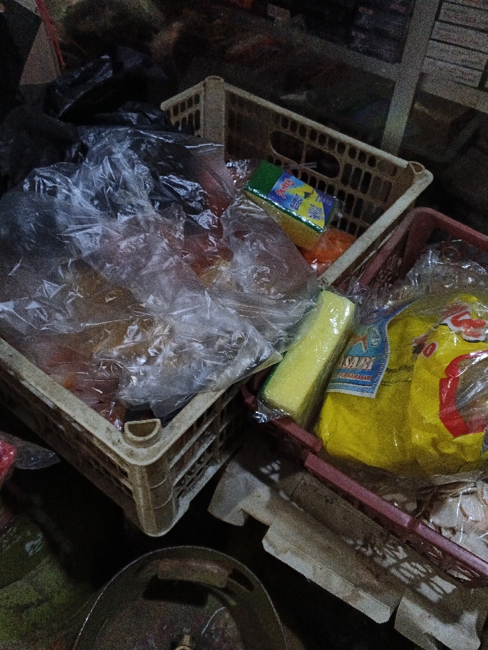 This image captures a dimly lit indoor scene, identified as a storage or retail area in Pinnwe, Myanmar (Burma). The foreground shows a partial view of a dark, metallic, circular object, consistent with the top of a gas cylinder or large container. The midground is dominated by two plastic crates. The left crate is light brown and filled with various items, predominantly in clear plastic bags, with a black plastic bag resting on top. A small green and yellow package, labeled "Polly," is visible near the top edge of this crate. The right crate, dark red, also contains packaged goods, including a yellow rectangular sponge enclosed in clear plastic. Adjacent to the sponge is a larger yellow package with visible text "ASARI" and "PURNA MASARI." The background is dark and indistinct, suggesting shelving or other stored inventory. No individuals are present in the frame.