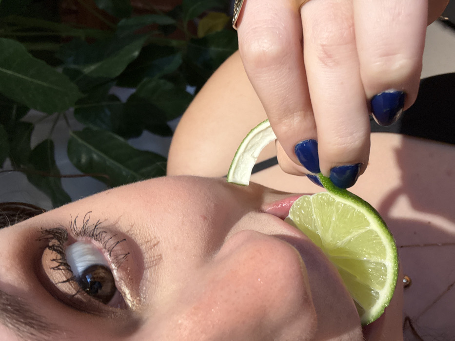 A person lies down with a slice of lime covering the mouth and upper lip. A hand with dark blue nail polish holds the lime in place. Part of the lime peel rests on the nose. One eye is visible, looking upward and away. Green leafy plants appear in the background. The skin tone of the person is light. A ring is visible on the hand holding the lime.