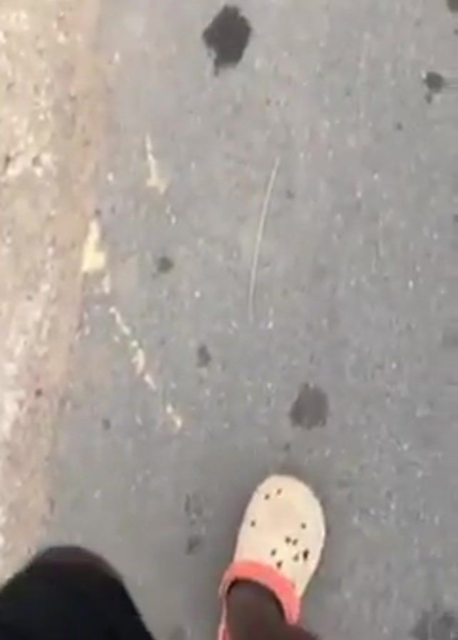 The video starts with a close-up shot of a person walking on a paved surface, wearing black shorts and a beige Croc with a red strap. The camera then pans up to show a street. There are cars driving and people walking along the side of the road. The sky is overcast.