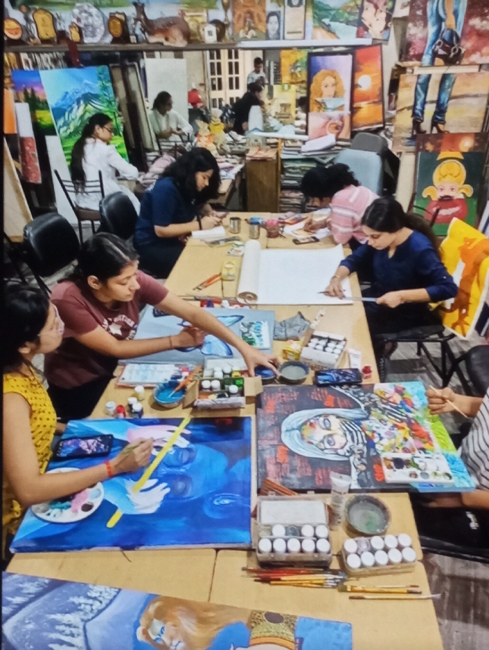 The image depicts an active art studio or classroom located in Aktash, Uzbekistan. Approximately nine individuals, predominantly young adults, are seated at long, light-colored tables, actively engaged in creating art. In the foreground, from left to right: a person in a yellow patterned top with glasses is painting a large blue canvas featuring abstract white hands and faces using a yellow-handled brush; a person in a maroon t-shirt is reaching towards a blue canvas; a person in a dark blue top is drawing or sketching on a large white paper roll; and a person in a striped top (partially visible) is painting a canvas with a colorful, abstract portrait. The tables are covered with various art supplies, including numerous paint pots, palettes, brushes, pencils, rulers, and water containers. Several canvases are in different stages of completion. The midground and background reveal more participants seated at additional tables, also focused on their artworks. The walls are densely covered with a wide array of completed or in-progress paintings, showcasing diverse styles and subjects such as landscapes, portraits, and abstract art. Shelves above the workstations display more art, trophies, and decorative objects. A multi-paned window is visible in the background, illuminating the indoor artistic workspace.