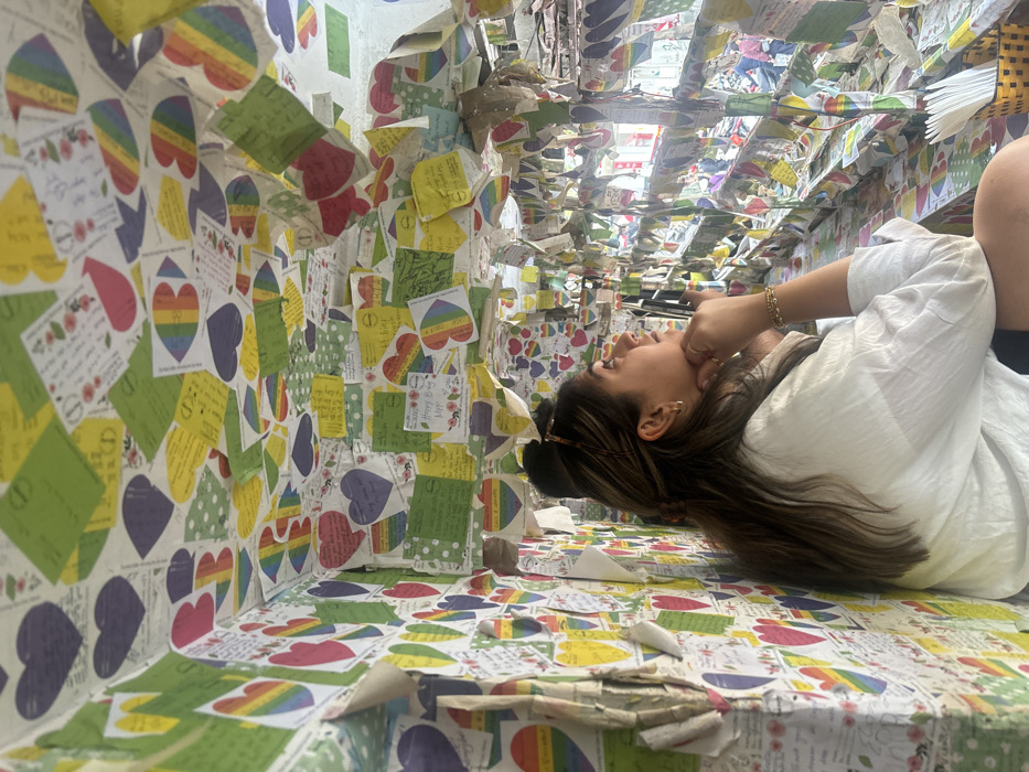 A person lies in a confined space adorned with colorful paper. Hearts, rainbows, floral patterns, and handwritten notes cover the walls, floor, and ceiling. The individual wears a white shirt and a gold bracelet. They're looking upwards, with a hand near their face. The space resembles a tunnel or box covered in decorative papers.