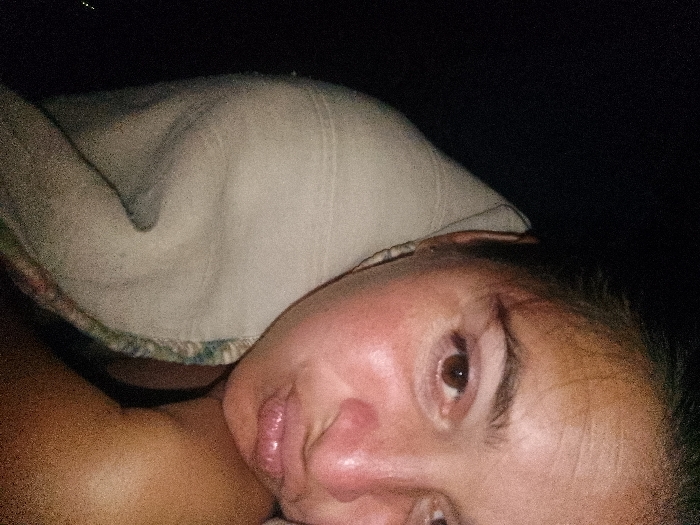 A person lies on a pillow with a floral edge. Their face, turned towards the viewer, is lit unevenly, showing a slightly sunburned complexion. One eye is open and dark, while the rest of the background fades into dark obscurity. The person's lips are slightly parted, and the focus is primarily on their face and the adjacent pillow.
