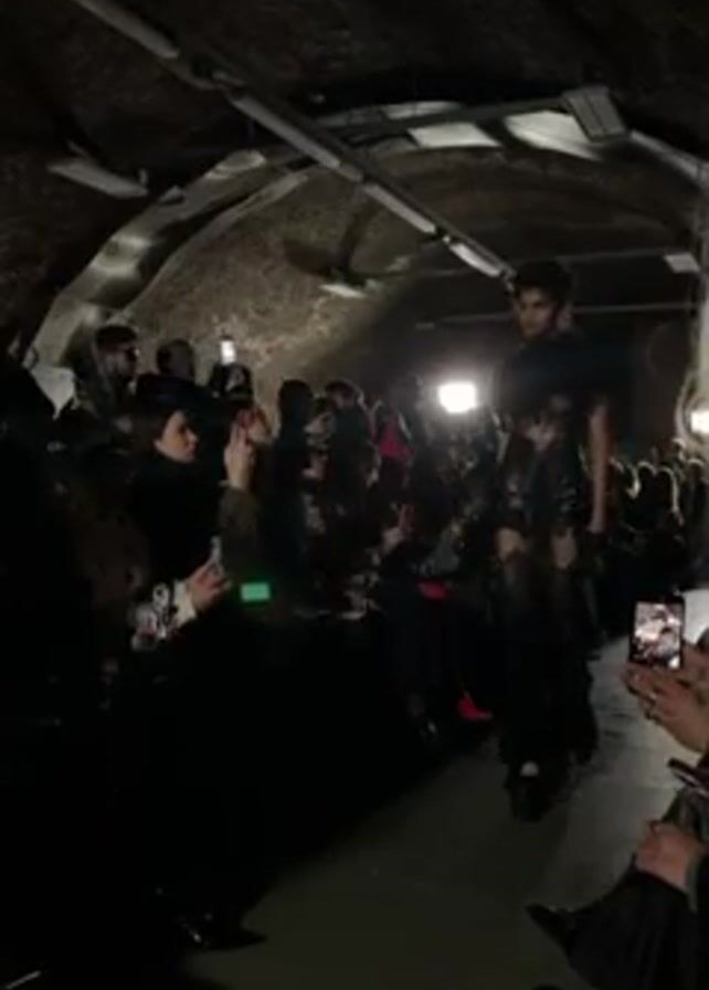 A fashion model walks down a runway as spectators take photos and videos. The model is wearing a black outfit with lace and a corset-like top. The audience is seated on either side of the runway. The runway is in a dimly lit, possibly underground, space with a low, arched ceiling. Artificial lights hang from the ceiling, illuminating the model's path. The attendees are dressed in various dark clothing, and many are holding up their smartphones to record the event.