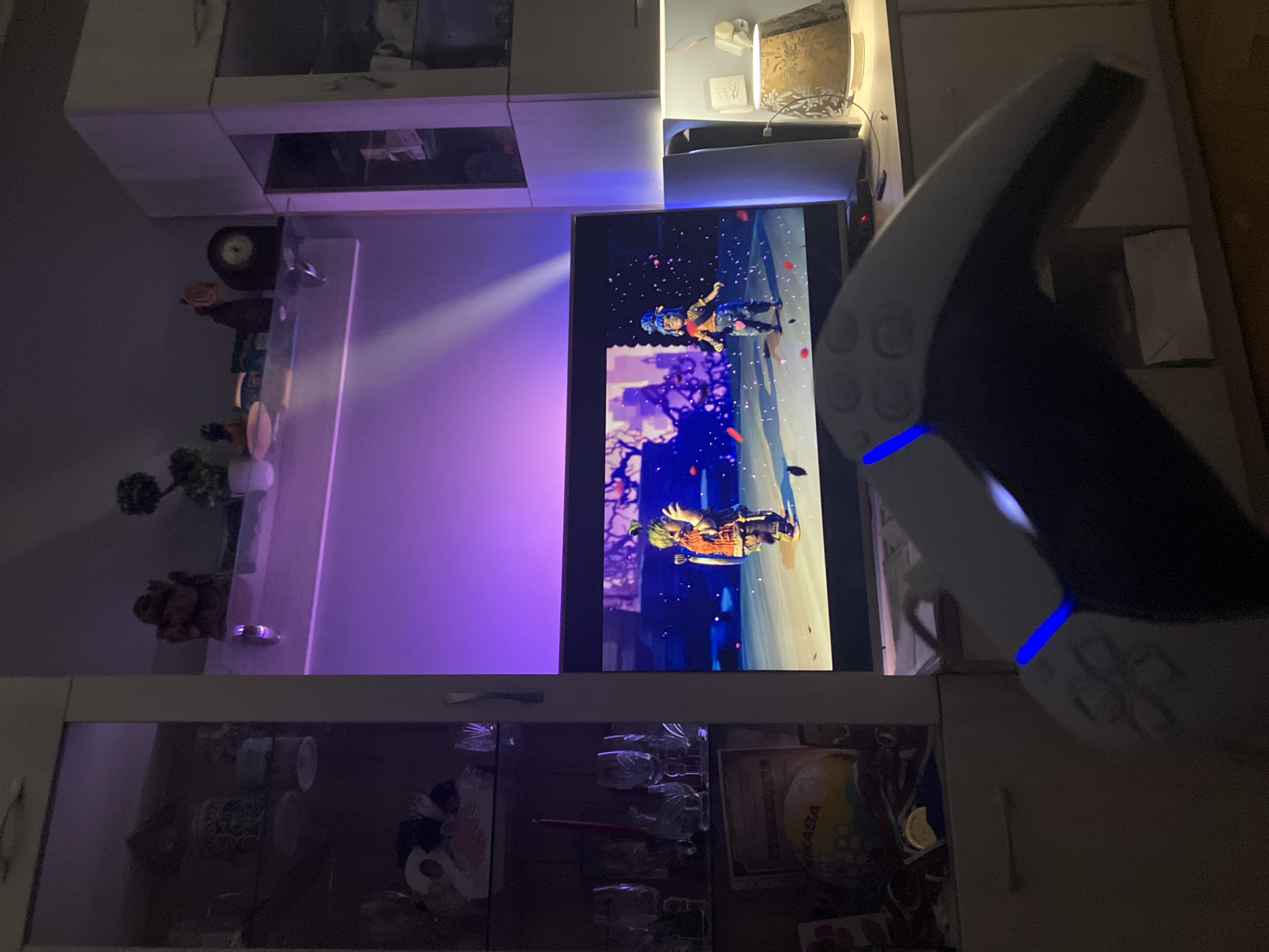 This image captures an indoor entertainment setup in Karlovo, Bulgaria, characterized by subdued lighting and a dominant purple ambient glow. The central focus is a large television screen displaying a scene from the video game "It Takes Two," featuring two animated, stylized characters on what appears to be a stage. The character on the left wears an orange-brown top and green pants, while the character on the right has blue hair and a blue-orange outfit; both are surrounded by falling pink and red confetti-like particles. In the immediate foreground, a white PlayStation 5 DualSense controller is partially visible, held at an angle with its blue light bar illuminated, indicating active gameplay. To the right of the television, a white PlayStation 5 console stands vertically, and next to it, a table lamp with a patterned shade casts a warm, yellowish light. The television rests on a light-colored media cabinet. To the left of the television, a display cabinet with glass doors reveals various items, including multiple pieces of glassware, a red decorative candle, a framed document, and a yellow and blue object labeled "MIKASA." Above the television, on a higher shelf, a small plant, a dark brown decorative statue, and a small, round-faced clock are visible. The purple ambient light originates from an LED strip positioned behind the television, casting a strong hue on the wall and ceiling.